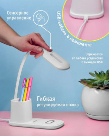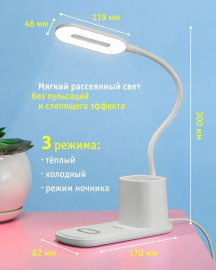 Аккумуляторный светодиодный настольный светильник с интегрированным светодиодным модулем. Наличие аккумулятора позволяет использовать автономно без подключения к сети питания. Литий-ионный аккумулятор обеспечивает до 6 часов автономной работы в режиме 20% яркости. Заряжается от любого устройства с выходом USB (ноутбук, ПК, портативный аккумулятор, сетевое зарядное устройство), USB-кабель в комплекте. Сенсорный включатель с 3 режимами цветовой температуры: теплый, холодный и приглушенный дневной белый (ночник). Мягкий, рассеянный свет без пульсаций и слепящего эффекта. Гибкая регулируемая ножка. Беспроводная зарядка мобильных устройств, поддерживающих стандарт питания Qi.