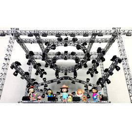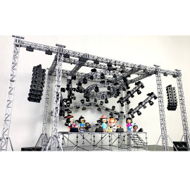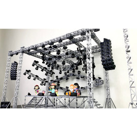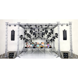 Состав комплекта: фермы с верхними балками, стыковочные кубы, цеповые лебёдки, основания ферм с распорами, сценические элементы системы лайер и настилы, лестницы, акустические линейные массивы, сабвуферы и мониторы, светодиодные экраны, световые прожекторы, кронштейны, хомуты и струбцины